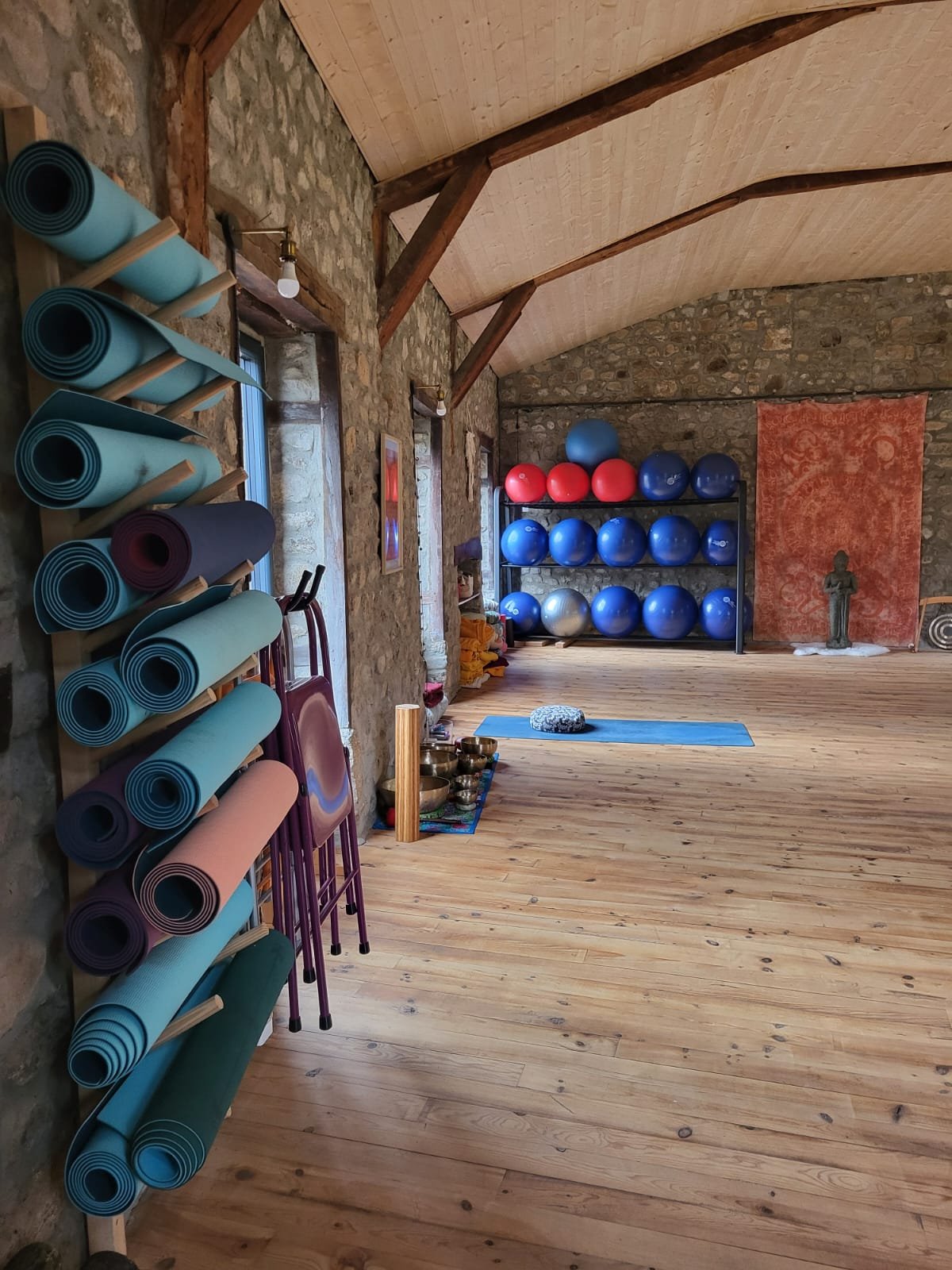 La salle est pensée pour s’adapter à différentes pratiques : yoga au sol et yoga aérien, Pilates, danse, méditation, relaxation, renforcement doux… Vous y trouverez tout le matériel nécessaire : tapis, briques, sangles, bolsters, zafus, chaises de yoga, feet-up, hamacs, ballons, bâtons, haltères, élastiques, bols tibétains… et même un petit coin salon pour échanger ou se reposer.