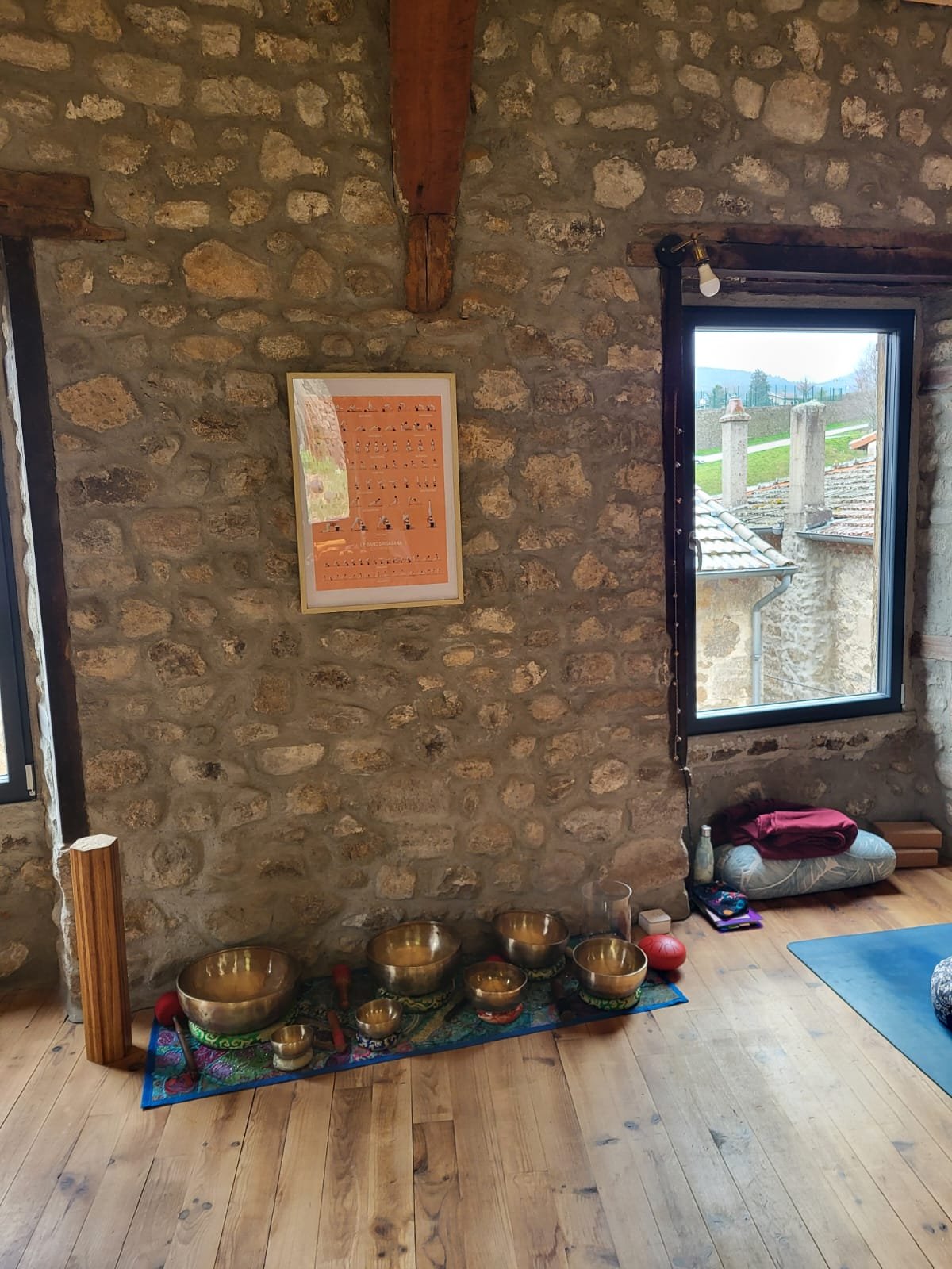 Vous pouvez y organiser des cours, ateliers, stages, retraites ou événements ponctuels. En option, je peux intervenir avec une relaxation sonore (bols tibétains, carillons…) pour enrichir vos séances.